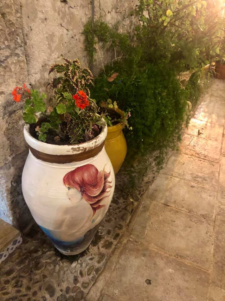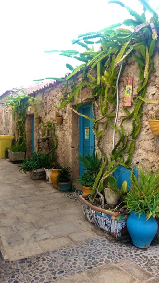 Sembra di essere in un dipinto “vivente” con le porte delle piccole case di pietra dipinte di blu o rosso, con le sedie di legno colorate di azzurro e le tavole coperte da tovaglie ricche di merletti. Impossibile non fermarsi a fotografare e farsi fotografare come ho fatto io vicino ai vasi dipinti o alle pareti colorate.